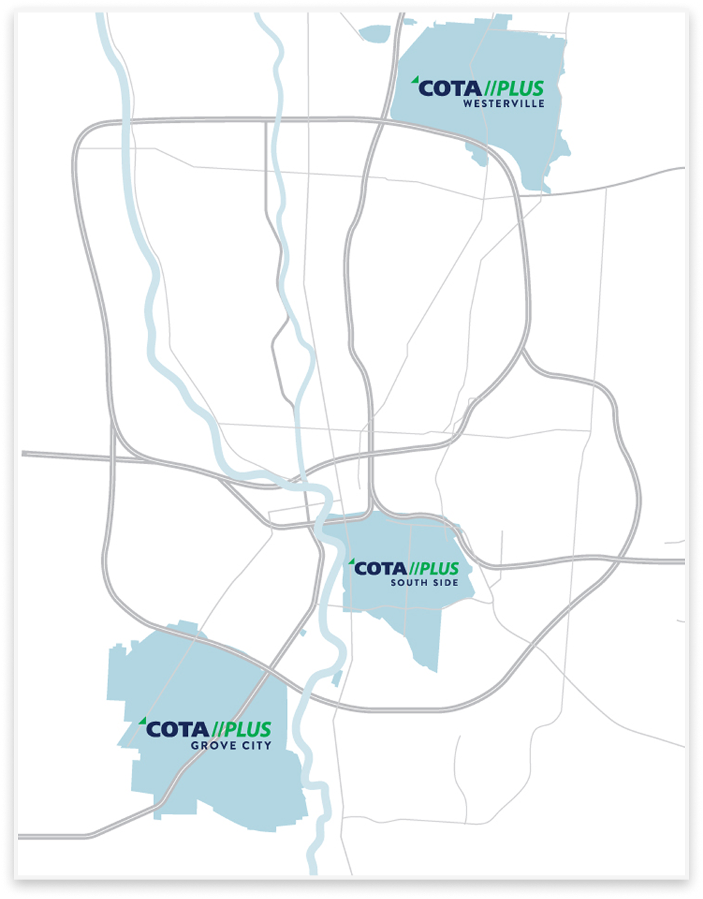 There are currently three COTA//Plus zones serving Central Ohio communities: